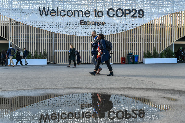 2024年11月15日,在阿塞拜疆首都巴库,人们经过联合国气候变化巴库大会的会场。新华社记者 曹阳 摄