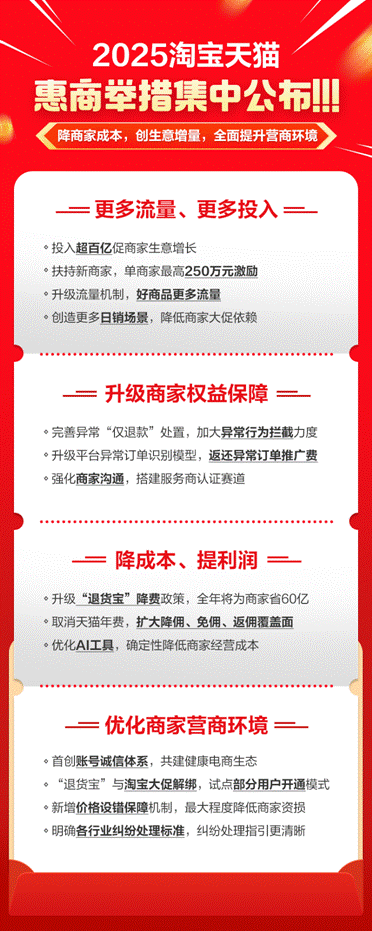 1月20日,淘宝天猫集中公布2025年12项惠商举措,以降低商家成本负担,帮助商家创造生意增量,全面提升商家营商环境。
