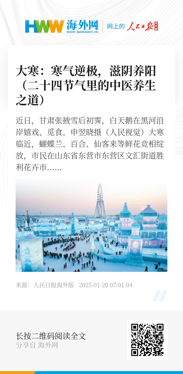 2025年1月20日为大寒日。此时节,寒野苍茫,天寒地坼,朔风裹着冷意呼啸而来,河流湖泊多被坚冰覆盖,暗藏的生机在冰霜里萌芽,青松翠柏劲韧常青,空气中似有梅香浮动。至此,节气轮转了一圈,准备开始新一年的轮回。