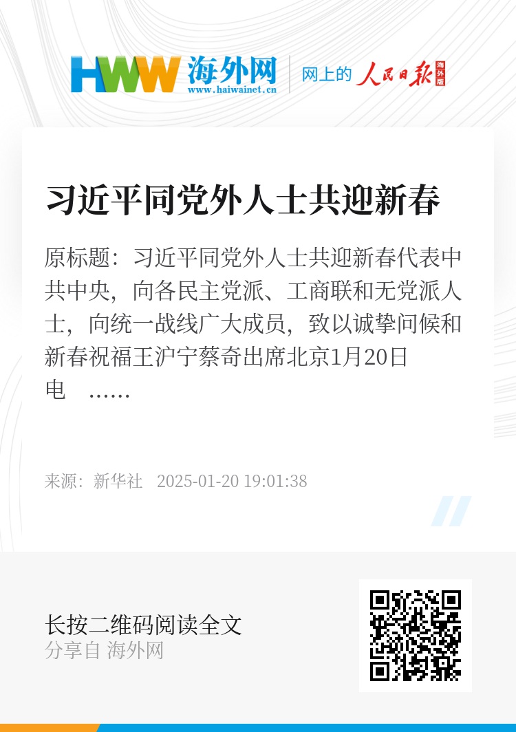 新华社北京1月20日电 在中华民族传统节日乙巳蛇年春节即将到来之际,中共中央总书记、国家主席、中央军委主席习近平20日下午在人民大会堂同各民主党派中央、全国工商联负责人和无党派人士代表欢聚一堂,共迎佳节。习近平代表中共中央,向各民主党派、工商联和无党派人士,向统一战线广大成员,致以诚挚问候和新春祝福。