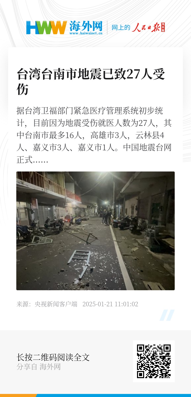 中国地震台网正式测定,1月21日0时17分,台湾台南市发生6.2级地震,震源深度14公里。