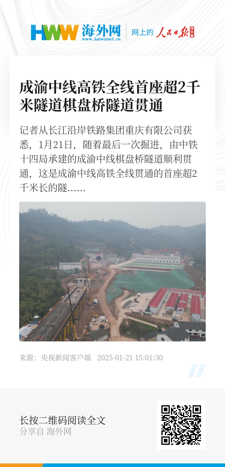 成渝中线高铁建成后,将与已运营的西成高铁、郑万高铁和在建的成西高铁、成达万高铁、西渝高铁、渝昆高铁、渝万高铁等多条线路连通,川渝地区路网结构更加完善,将极大便利沿线人民群众出行,成渝两地旅行时间进一步压缩,有力推进成渝地区双城经济圈建设。(总台记者 李洪淼 张波俊)
