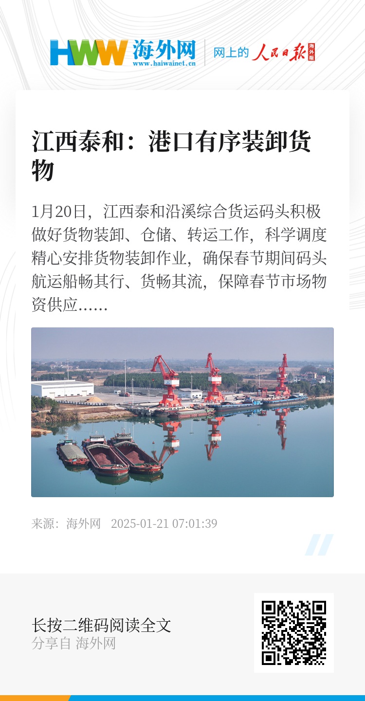 1月20日,江西泰和沿溪综合货运码头积极做好货物装卸、仓储、转运工作,科学调度精心安排货物装卸作业,确保春节期间码头航运船畅其行、货畅其流,保障春节市场物资供应。图片来源:视觉中国