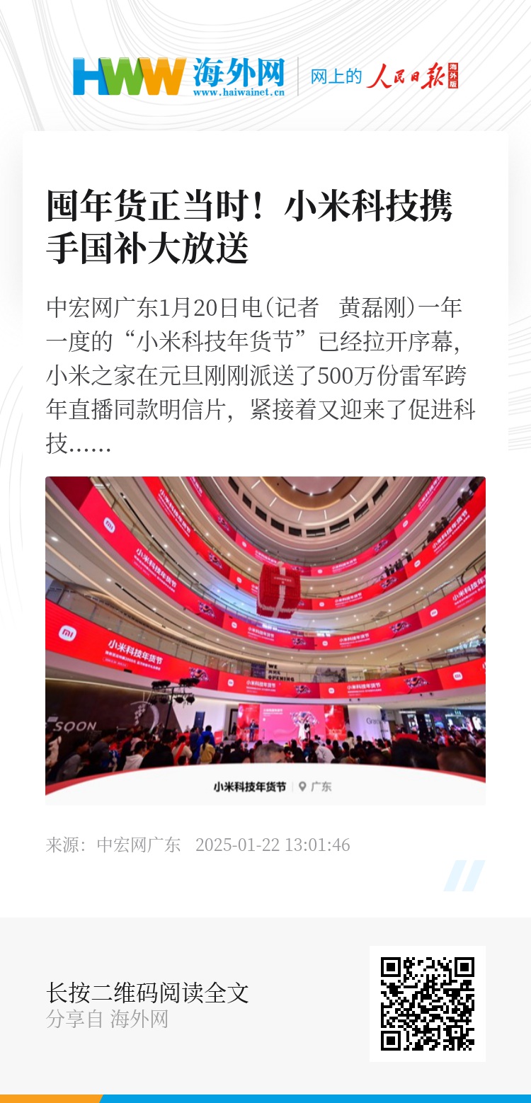 中宏网广东1月20日电(记者 黄磊刚)一年一度的“小米科技年货节”已经拉开序幕,小米之家在元旦刚刚派送了500万份雷军跨年直播同款明信片,紧接着又迎来了促进科技年货消费的重头戏——“国补”。今年的“国补”中央财政将大幅增加资金规模,且已经预下达810亿元资金,保障元旦、春节“两新”政策接续实施。今年的“国补”政策有何升级?小米哪些商品支持国补?让我们来一探究竟。