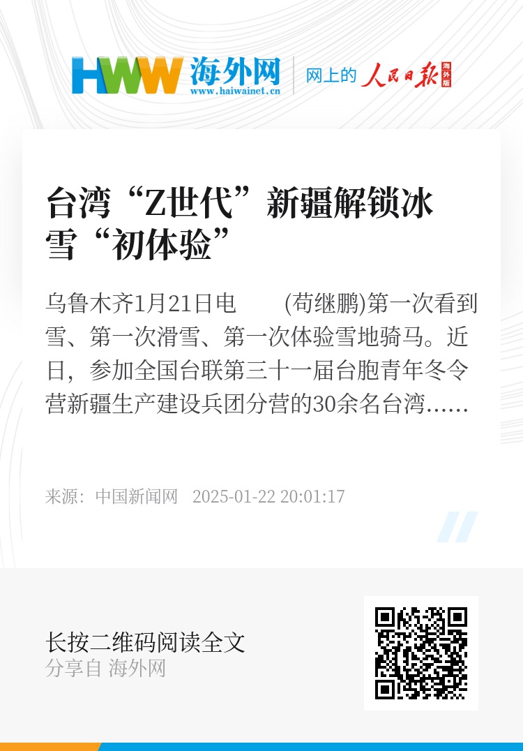 从冰雪运动,到历史文化,再到民俗风情,活动期间,台湾青年们亲眼观察、亲耳倾听、亲身体验新疆的多元文化和发展成就,深入感受新疆冰雪之趣。系列活动不仅为台湾青年们打开一扇了解新疆的窗口,更为两岸青年搭建起交流与互动的桥梁。