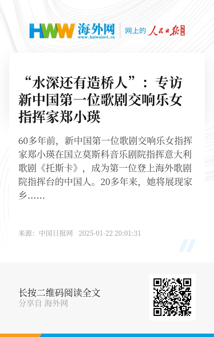60多年前,新中国第一位歌剧交响乐女指挥家郑小瑛在国立莫斯科音乐剧院指挥意大利歌剧《托斯卡》,成为第一位登上海外歌剧院指挥台的中国人。20多年来,她将展现家乡风貌的交响诗篇《土楼回响》带到12个国家和地区,上演了78场,每到一处就组织当地的合唱团一起演唱《客家之歌》。今天,她不仅将外国歌剧翻成我们更熟悉的中国话,也让更多外国人从她的作品中听懂中国。“水深还有造桥人”,这句耳熟能详的客家山歌,正是她的生动写照。和#开箱中国 一起,听听“90后”的郑小瑛向世界传递的中国声音。