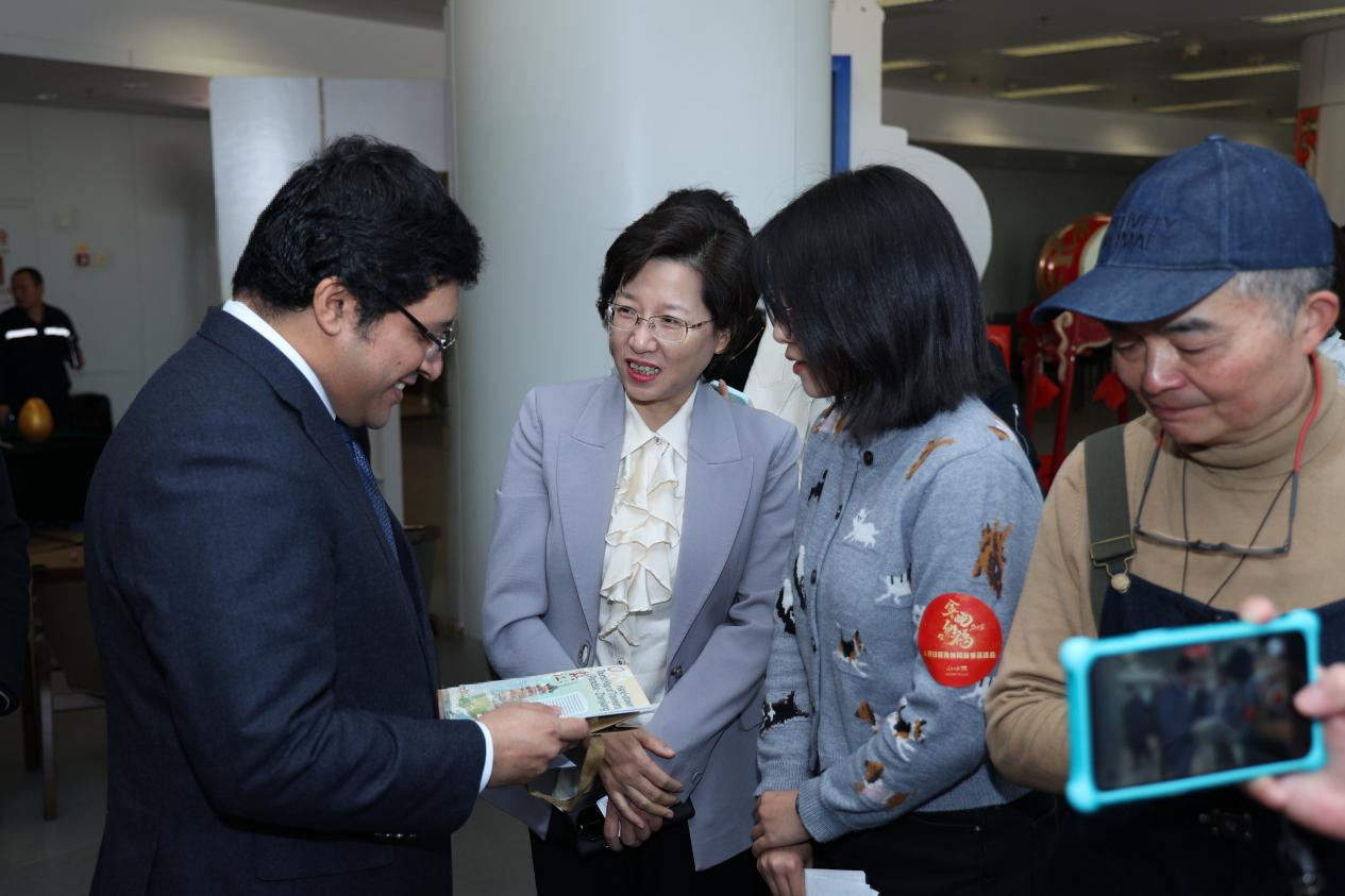 本次新春茶话会正值腊月二十三,是中国农历小年,临近首个“非遗版春节”,现场专门设置了非遗项目展区,驻华使节在来自镇江的剪纸、面塑、泥叫等非遗展台前驻足欣赏,体验了富有镇江地方特色的非遗文化项目。殷敏与现场多位驻华使节亲切交谈,赠送镇江非遗纪念品,并互致新年问候。