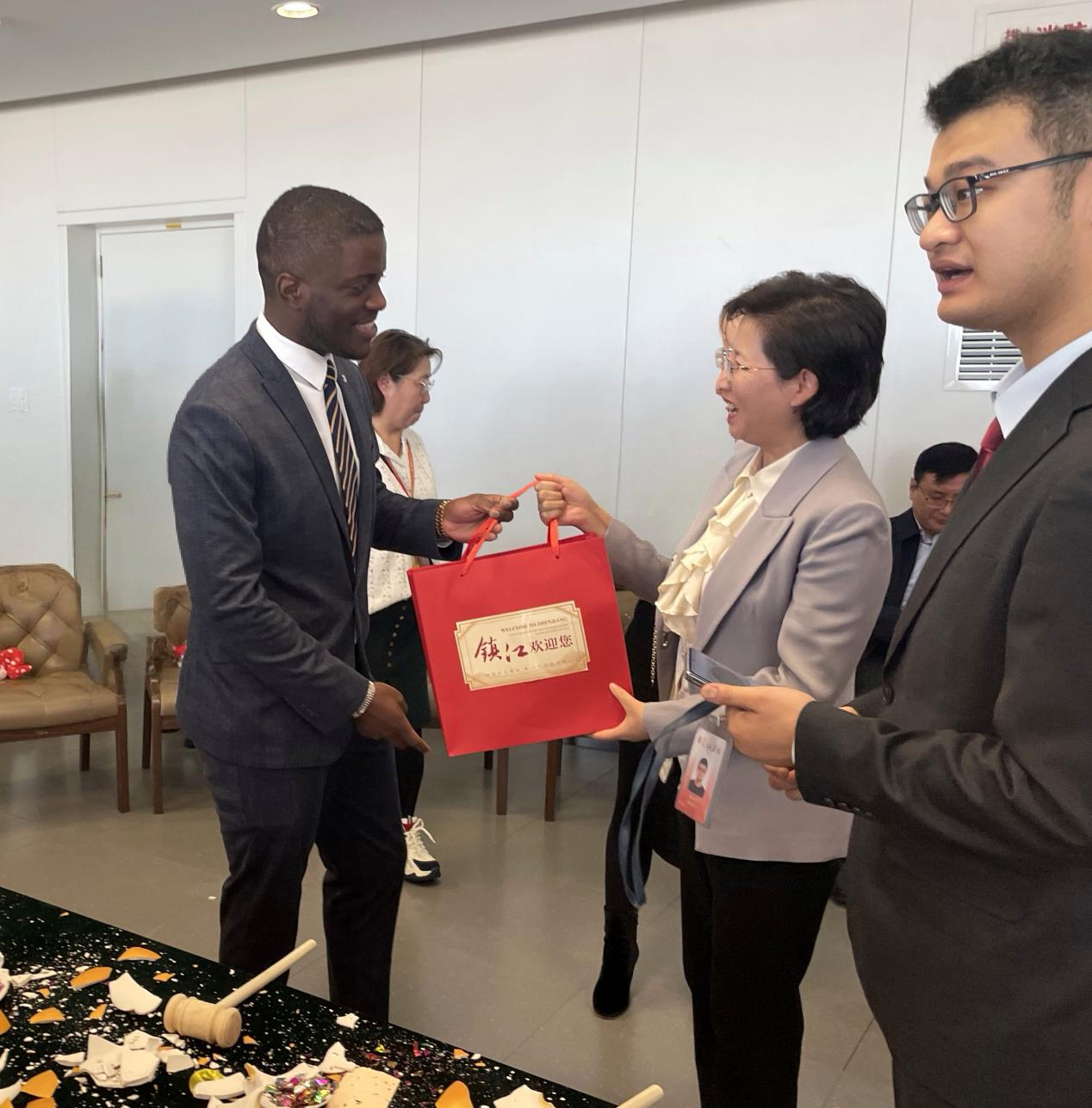 殷敏给驻华大使赠送镇江非遗纪念品