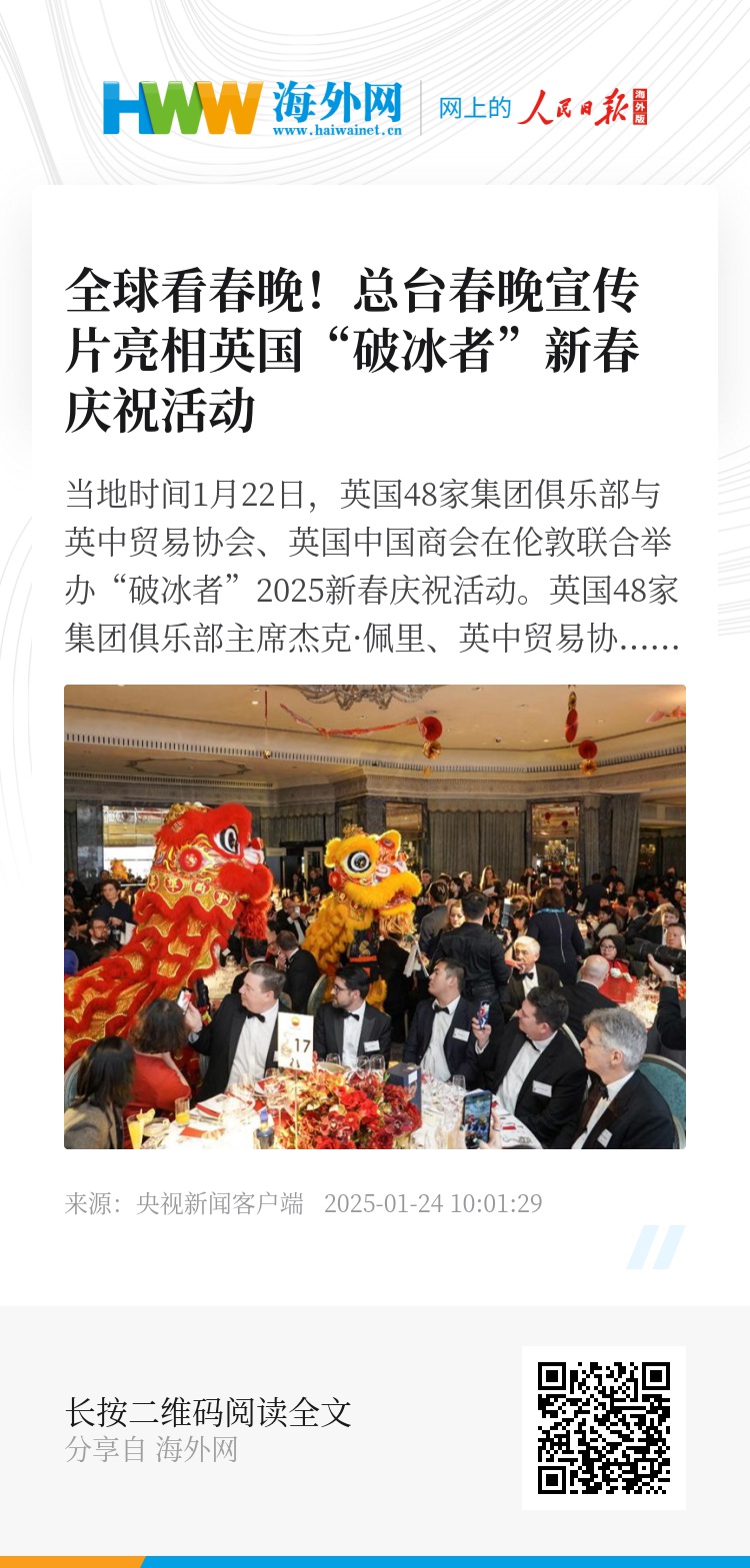当地时间1月22日,英国48家集团俱乐部与英中贸易协会、英国中国商会在伦敦联合举办“破冰者”2025新春庆祝活动。英国48家集团俱乐部主席杰克·佩里、英中贸易协会主席古沛勤等中英各界人士500多人出席。