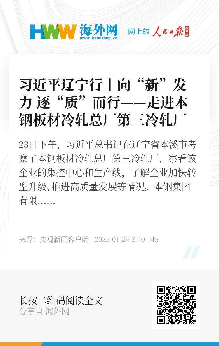 23日下午,习近平总书记在辽宁省本溪市考察了本钢板材冷轧总厂第三冷轧厂,察看该企业的集控中心和生产线,了解企业加快转型升级、推进高质量发展等情况。
