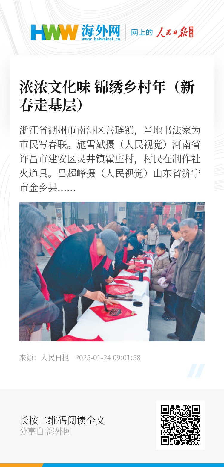 “笔走龙蛇歌盛世,民携幸福贺新春”……临近春节,浙江省湖州市南浔区善琏镇的湖笔文化公园里,红色春联高高挂起,各式“福”字热烈喜庆,墨香四溢。排队领取用湖笔写就的春联,上海游客张艳格外开心,“很有仪式感,很有纪念意义。”