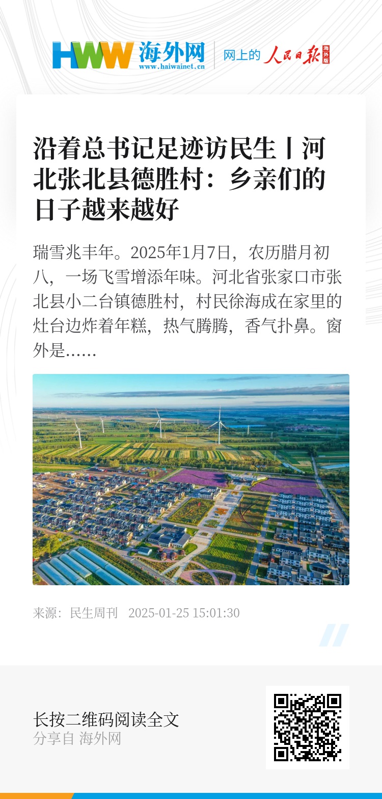瑞雪兆丰年。2025年1月7日,农历腊月初八,一场飞雪增添年味。河北省张家口市张北县小二台镇德胜村,村民徐海成在家里的灶台边炸着年糕,热气腾腾,香气扑鼻。窗外是一排排新建成不久的村民安置新居,有的已经挂起了红灯笼,整个村庄在白雪的映衬下,越发显得祥和、喜庆、美丽。