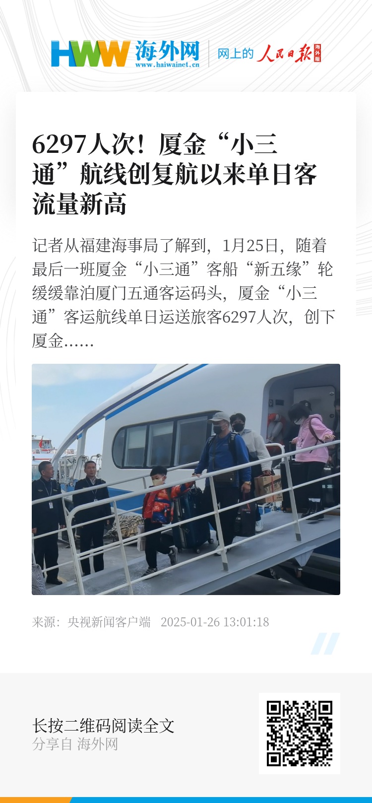 记者从福建海事局了解到,1月25日,随着最后一班厦金“小三通”客船“新五缘”轮缓缓靠泊厦门五通客运码头,厦金“小三通”客运航线单日运送旅客6297人次,创下厦金“小三通”客运航线复航以来单日旅客人数新高。