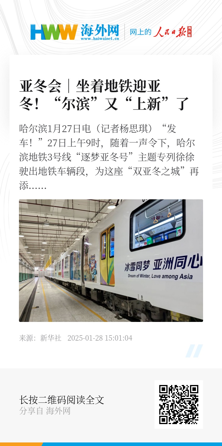 新华社哈尔滨1月27日电(记者杨思琪)“发车!”27日上午9时,随着一声令下,哈尔滨地铁3号线“逐梦亚冬号”主题专列徐徐驶出地铁车辆段,为这座“双亚冬之城”再添一处“打卡地”。