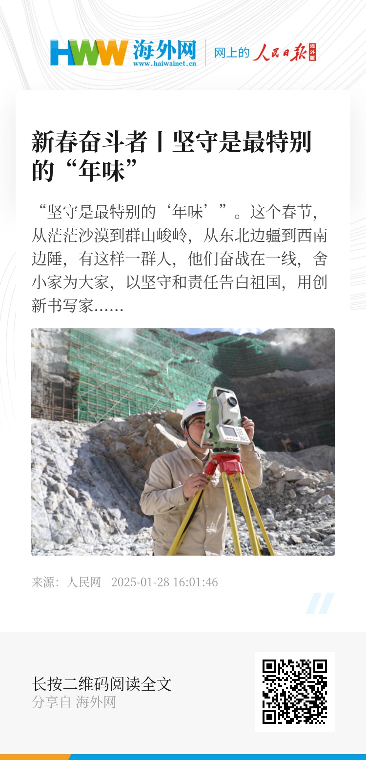 “坚守是最特别的‘年味’”。这个春节,从茫茫沙漠到群山峻岭,从东北边疆到西南边陲,有这样一群人,他们奋战在一线,舍小家为大家,以坚守和责任告白祖国,用创新书写家国情怀,守护万家灯火,温暖百姓生活,镌刻下奋斗中国的美丽剪影。