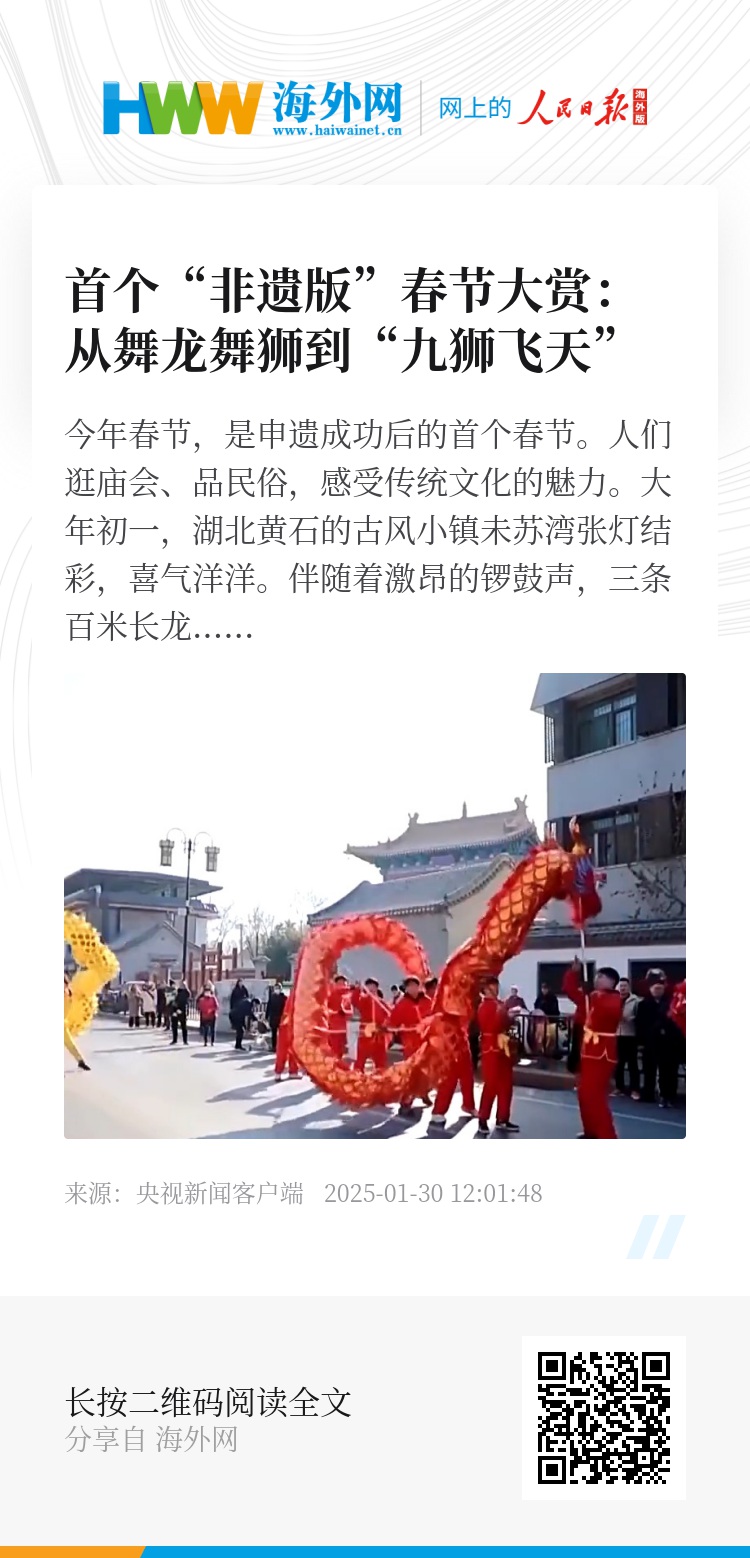 据了解,《九狮飞天》作为传统非遗有100多年的历史了,以九狮闹春营造浓浓年味,迎接八方来客。
