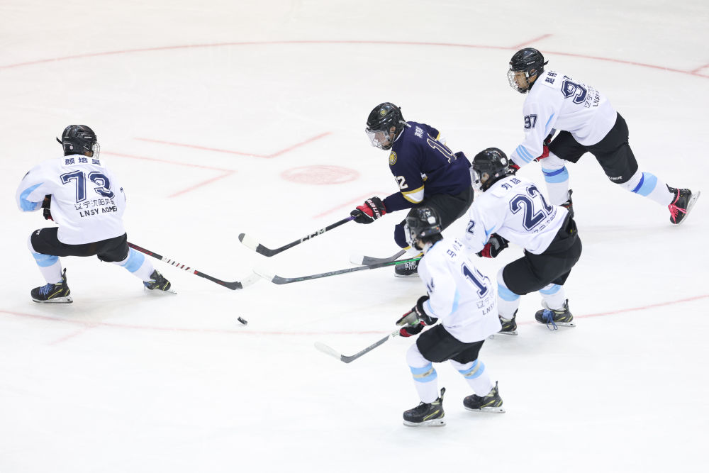2024年12月8日,北京京狮男子冰球队球员蒋思雄(中)在比赛中突破。当日,在2024-2025赛季中国男子冰球职业联赛(齐齐哈尔站)比赛中,北京京狮男子冰球队8比0战胜辽宁沈阳奥美冰球俱乐部队。新华社记者 张涛 摄