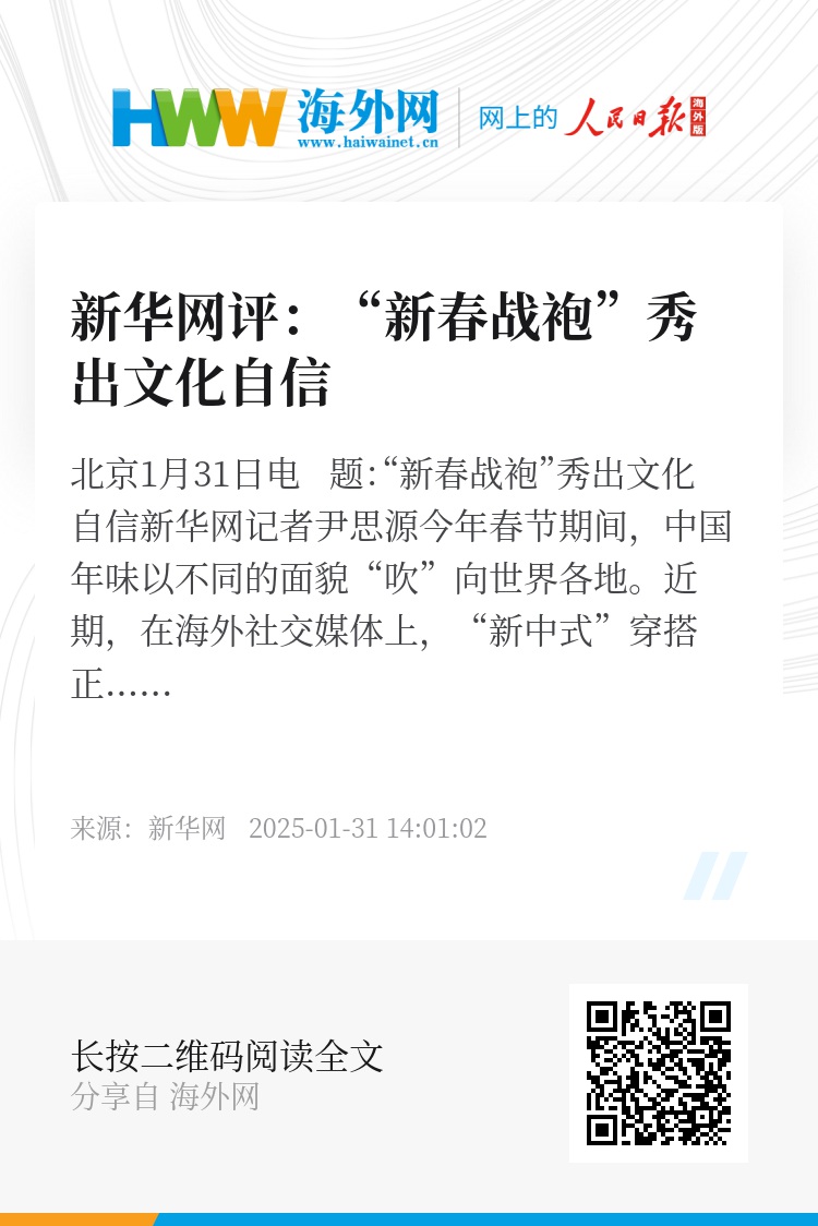 “新春战袍”海外圈粉,秀出的不仅是传统技艺,还有我们的文化自信,它让中国年味以更多元的姿态走向世界。
