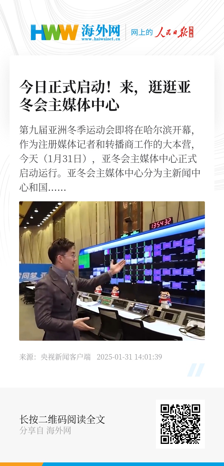 第九届亚洲冬季运动会即将在哈尔滨开幕,作为注册媒体记者和转播商工作的大本营,今天(1月31日),亚冬会主媒体中心正式启动运行。