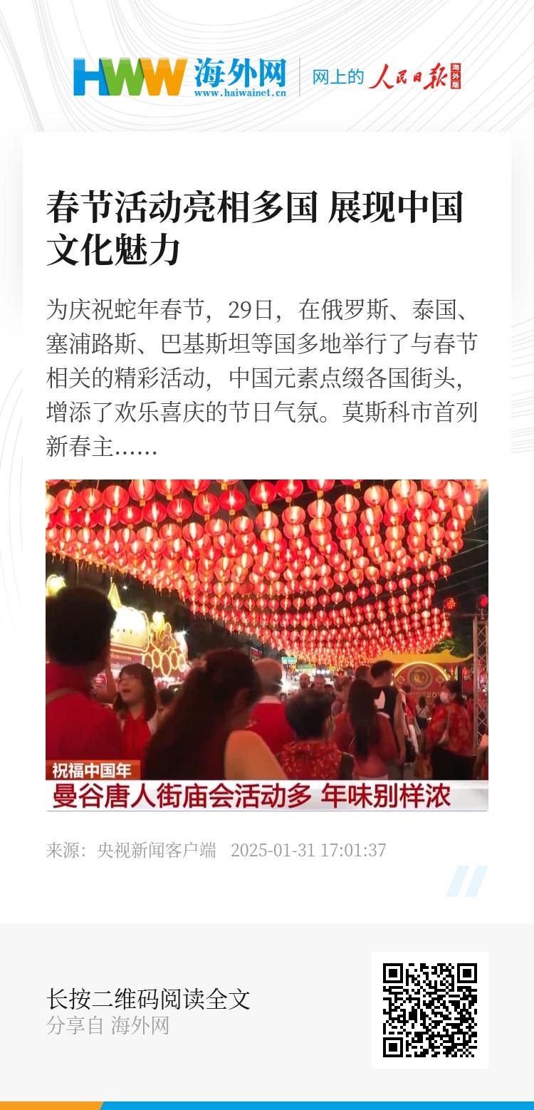 为庆祝蛇年春节,29日,在俄罗斯、泰国、塞浦路斯、巴基斯坦等国多地举行了与春节相关的精彩活动,中国元素点缀各国街头,增添了欢乐喜庆的节日气氛。