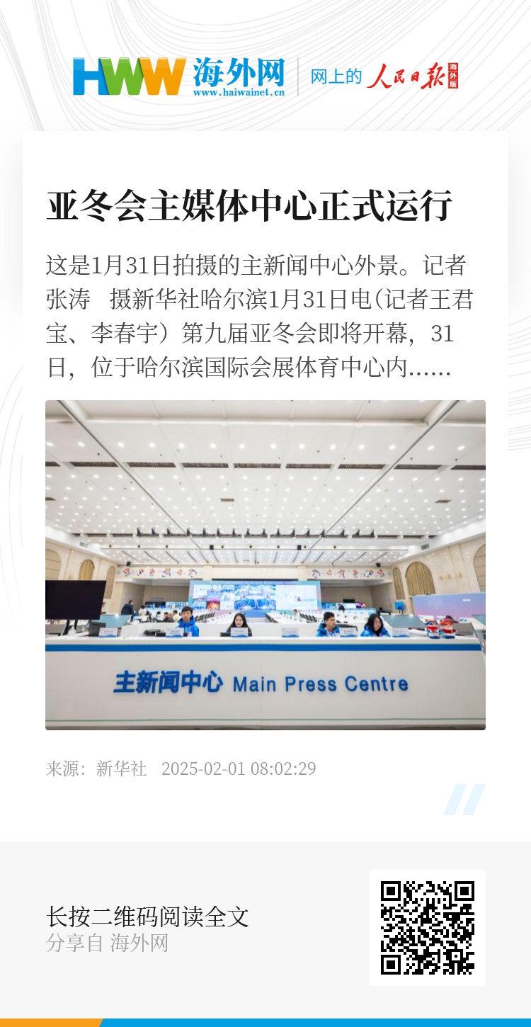 新华社哈尔滨1月31日电(记者王君宝、李春宇)第九届亚冬会即将开幕,31日,位于哈尔滨国际会展体育中心内的主媒体中心正式启动运行。