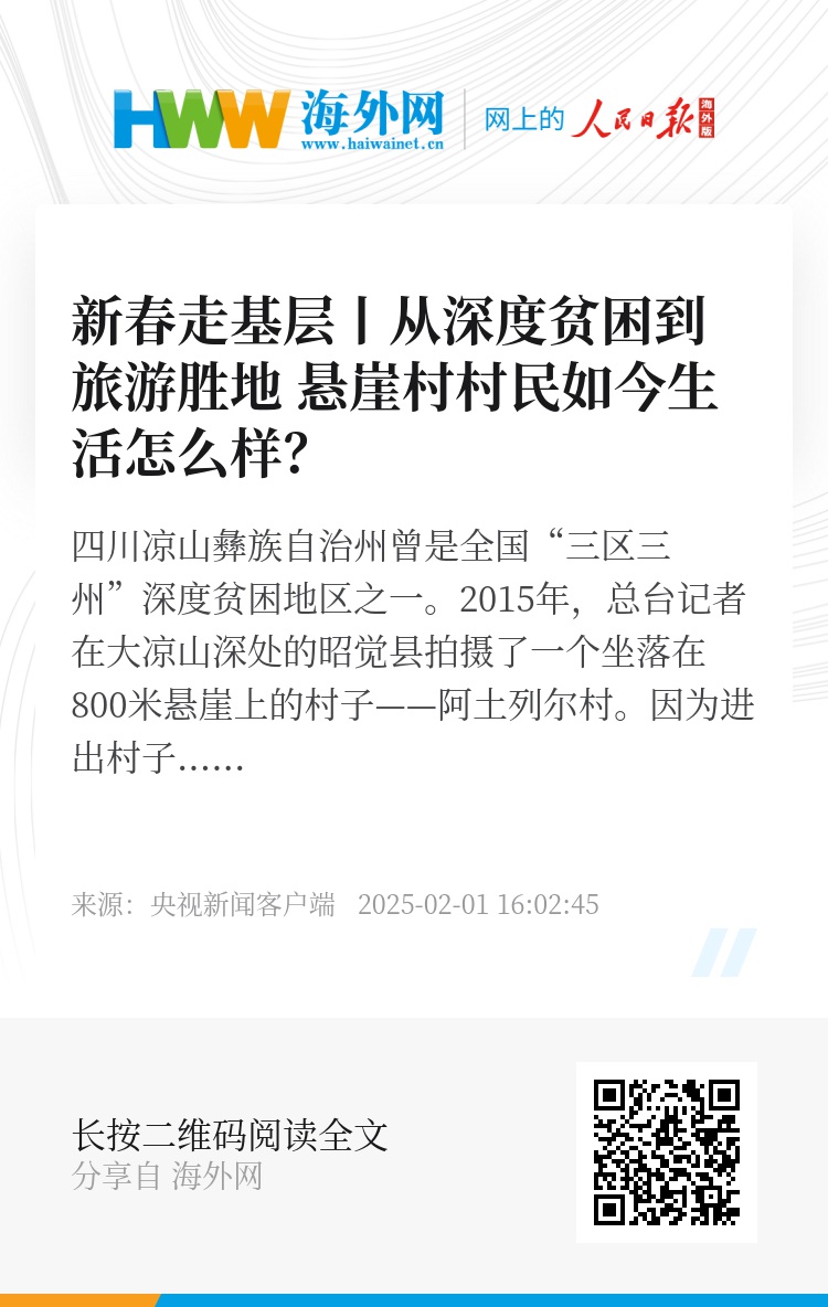 四川凉山彝族自治州曾是全国“三区三州”深度贫困地区之一。2015年,总台记者在大凉山深处的昭觉县拍摄了一个坐落在800米悬崖上的村子——阿土列尔村。因为进出村子必须攀悬崖、爬峭壁,报道中称这里为“悬崖村”。后来,阿土列尔村和周边村社合并,正式命名为悬崖村。2020年5月,按照国家易地扶贫搬迁的政策要求,昭觉县5.45万名贫困群众搬迁到县城的5个大型社区集中安置,悬崖村282户1219人也陆续搬下悬崖,住进了县城的楼房。悬崖村的村民现在生活怎么样?