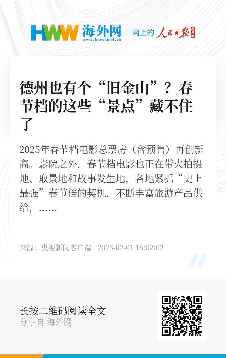 2025年春节档电影总票房(含预售)再创新高。影院之外,春节档电影也正在带火拍摄地、取景地和故事发生地,各地紧抓“史上最强”春节档的契机,不断丰富旅游产品供给,推动电影和旅游市场的深度融合,为春节文旅市场注入新活力。