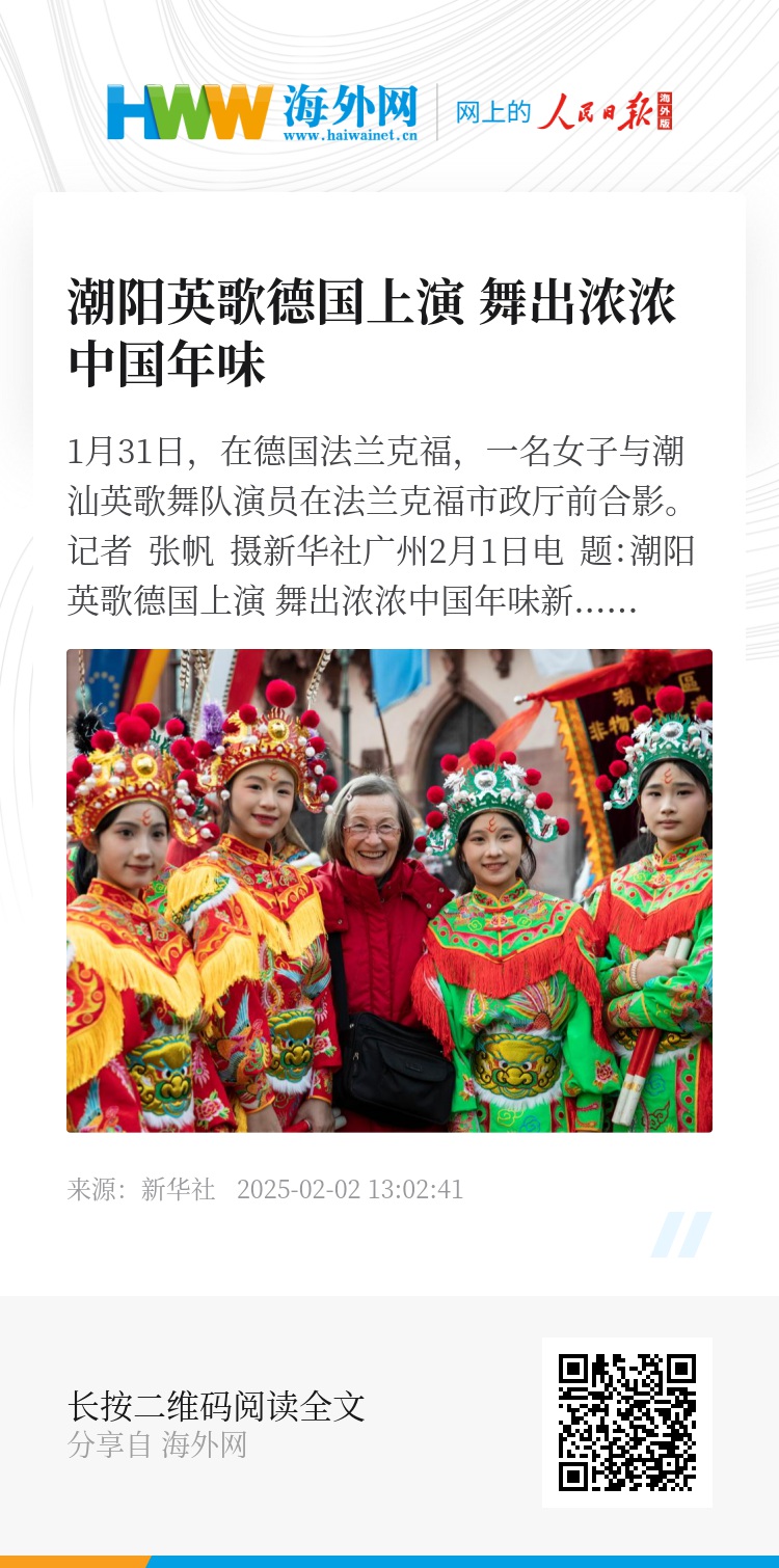 新华社广州2月1日电 题:潮阳英歌德国上演 舞出浓浓中国年味