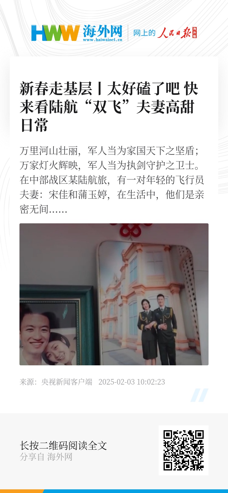 第81集团军某陆航旅 宋佳:我俩住在一个空勤楼里,她在四楼住,我在三楼住,我俩各自有自己的房间,在饭桌上坐在一起吃个饭,这就算见面了。