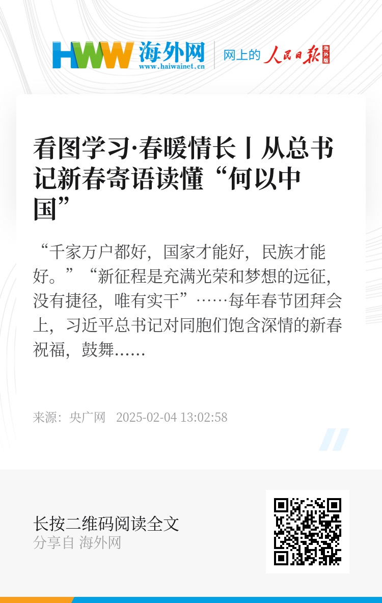“千家万户都好,国家才能好,民族才能好。”“新征程是充满光荣和梦想的远征,没有捷径,唯有实干”……每年春节团拜会上,习近平总书记对同胞们饱含深情的新春祝福,鼓舞人心、凝聚力量。让我们重温这些暖心寄语,在新的一年里,坚定信心、满怀希望,以蛇行千里的劲头,为实现更加美好的未来不懈奋斗!