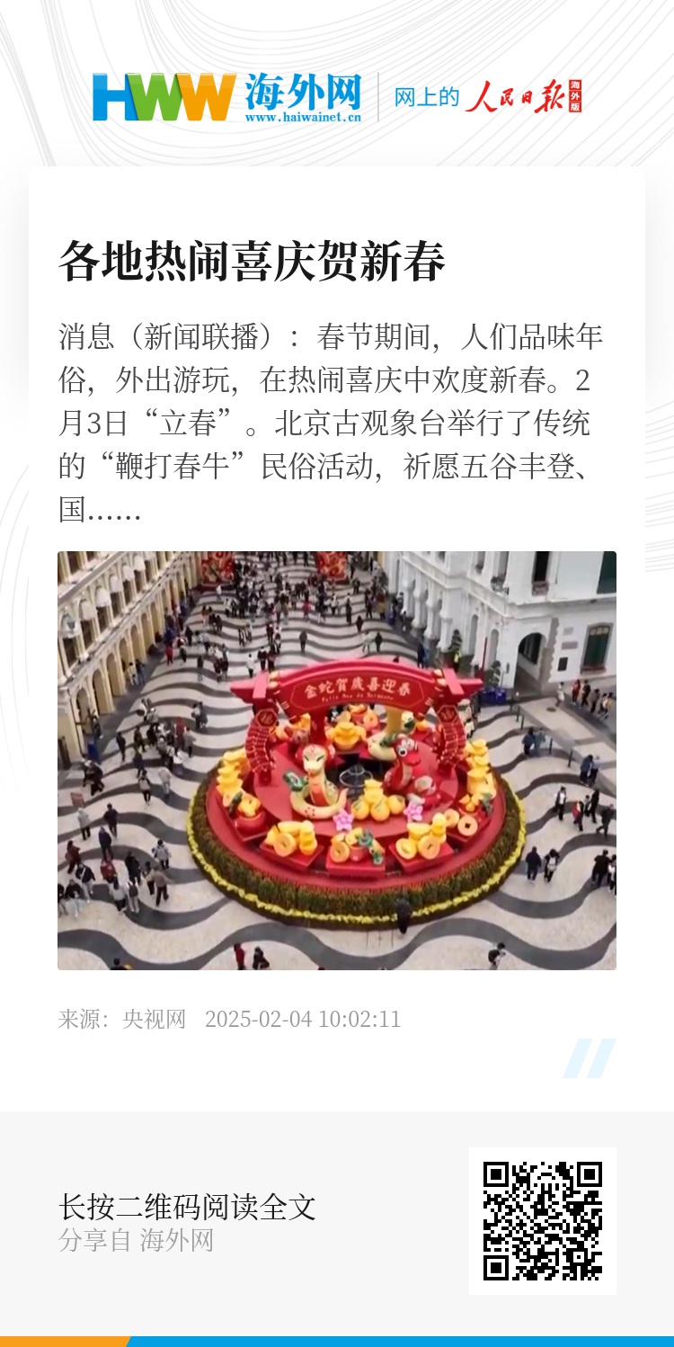 2月3日“立春”。北京古观象台举行了传统的“鞭打春牛”民俗活动,祈愿五谷丰登、国泰民安;在江苏仪征,舞龙舞狮、锣鼓、秧歌,20多个民俗表演踩街闹新春,为市民游客送去欢乐与祝福;在深圳,机器人装扮的小狮子与传统的醒狮共同起舞,现代科技与传统习俗完美结合,赢得市民游客阵阵喝彩。