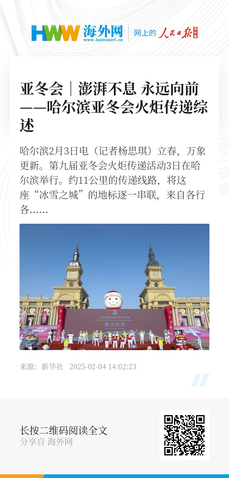 “虽然春节没有休息,但能为这场亚洲体育盛会做一点事情,我感到非常自豪。我要把勇于超越、顽强拼搏、永不言弃的体育精神传递给一线医护人员。”火炬手于波是2024年“白求恩奖章”获得者,他所在的哈尔滨医科大学附属第二医院是亚冬会定点医疗保障机构,在亚冬会期间提供全方位医疗服务。