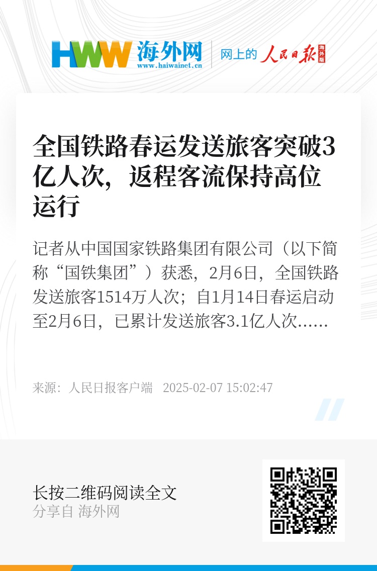 记者从中国国家铁路集团有限公司(以下简称“国铁集团”)获悉,2月6日,全国铁路发送旅客1514万人次;自1月14日春运启动至2月6日,已累计发送旅客3.1亿人次。2月7日,全国铁路预计发送旅客1410万人次,计划加开旅客列车1469列。