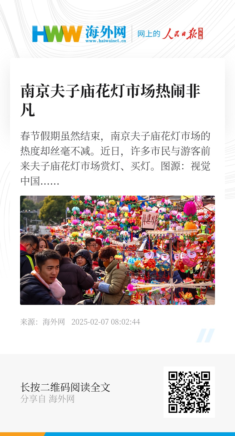 春节假期虽然结束,南京夫子庙花灯市场的热度却丝毫不减。近日,许多市民与游客前来夫子庙花灯市场赏灯、买灯。图源:视觉中国
