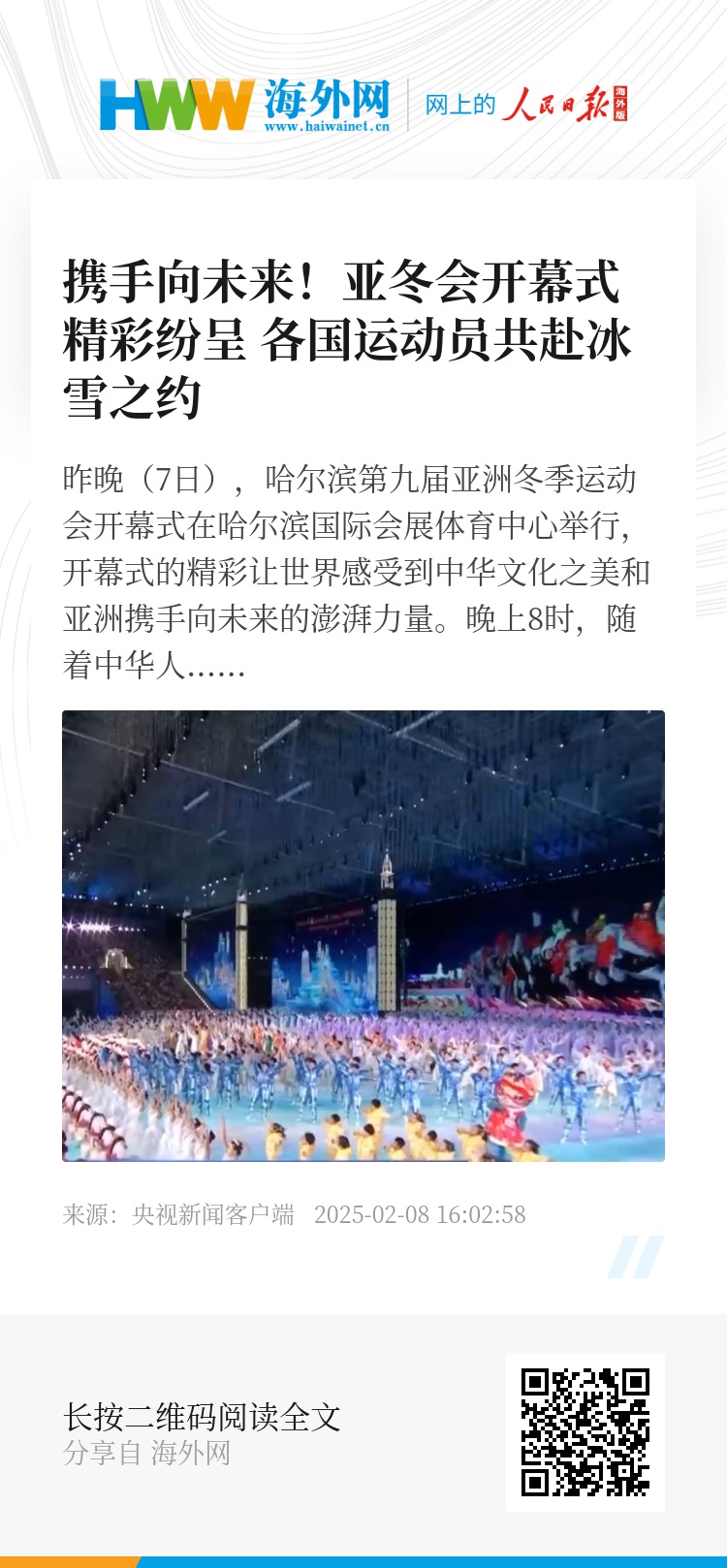 昨晚(7日),哈尔滨第九届亚洲冬季运动会开幕式在哈尔滨国际会展体育中心举行,开幕式的精彩让世界感受到中华文化之美和亚洲携手向未来的澎湃力量。