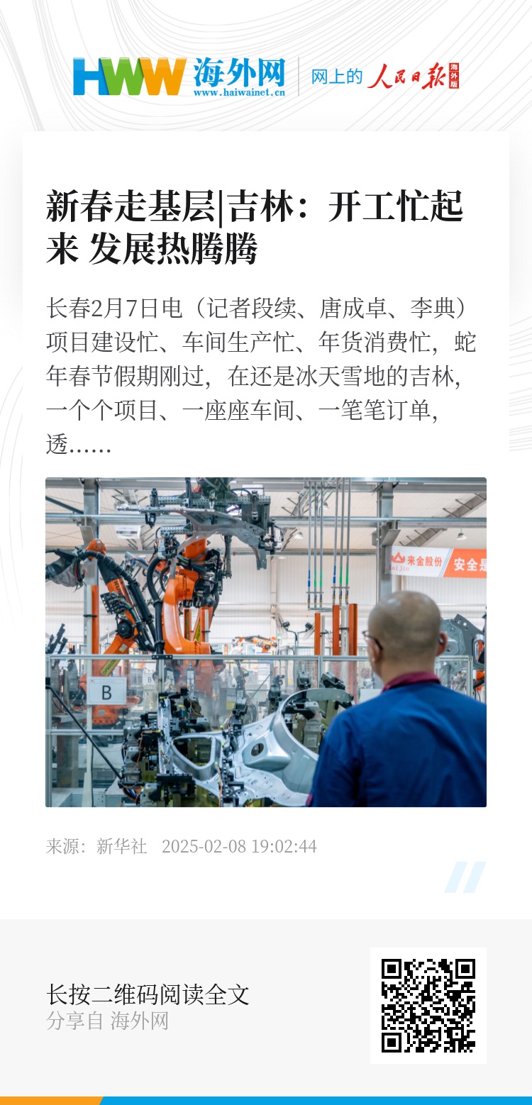 新华社长春2月7日电(记者段续、唐成卓、李典)项目建设忙、车间生产忙、年货消费忙,蛇年春节假期刚过,在还是冰天雪地的吉林,一个个项目、一座座车间、一笔笔订单,透着浓浓的忙活劲儿、热乎劲儿。