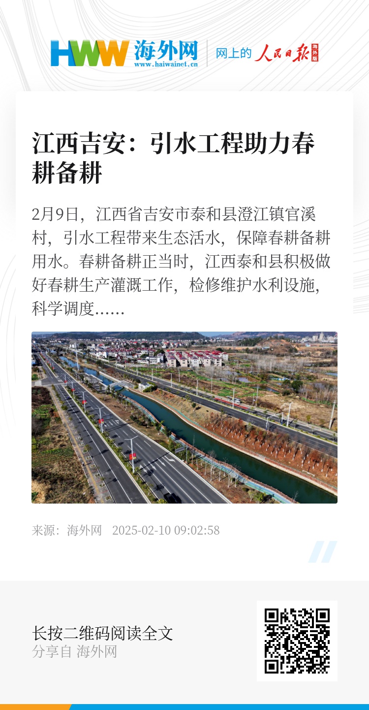 2月9日,江西省吉安市泰和县澄江镇官溪村,引水工程带来生态活水,保障春耕备耕用水。春耕备耕正当时,江西泰和县积极做好春耕生产灌溉工作,检修维护水利设施,科学调度分配水资源,确保春灌用水需求。图片来源:视觉中国