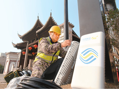 江西省宜春市万载县移动公司在人口密集的古城、龙湖等景区内新建27台5G设备,可满足现场2万多人移动网络通信需求,全面提升景区网络质量、助力文旅融合。图为近日,万载县移动公司工作人员在万载古城安装移动网络5G设备。邓龙华摄(人民视觉)
