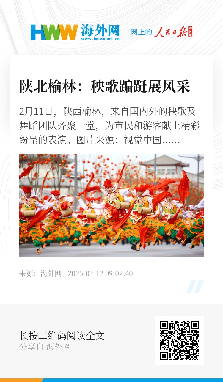 2月11日,陕西榆林,来自国内外的秧歌及舞蹈团队齐聚一堂,为市民和游客献上精彩纷呈的表演。