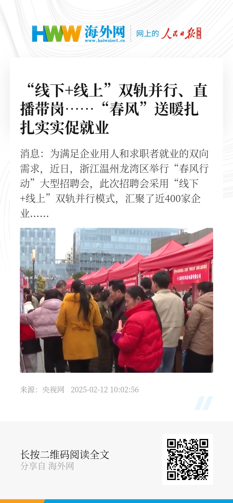 央视网消息:为满足企业用人和求职者就业的双向需求,近日,浙江温州龙湾区举行“春风行动”大型招聘会,此次招聘会采用“线下+线上”双轨并行模式,汇聚了近400家企业,提供超3.2万个岗位。