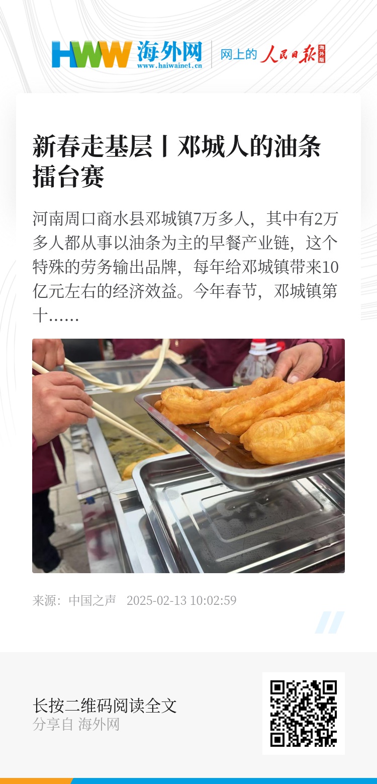 河南周口商水县邓城镇7万多人,其中有2万多人都从事以油条为主的早餐产业链,这个特殊的劳务输出品牌,每年给邓城镇带来10亿元左右的经济效益。今年春节,邓城镇第十届油条大赛隆重举行,在外从事早餐行业的大厨们,趁着过年返乡,在油锅前一决高下。