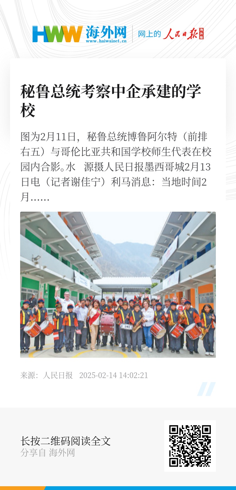 人民日报墨西哥城2月13日电(记者谢佳宁)利马消息:当地时间2月11日上午,秘鲁总统博鲁阿尔特考察位于拉利伯塔德大区的哥伦比亚共和国学校,察看教室、实验室等设施。该校由中国电建水电十一局承建。博鲁阿尔特高度评价学校建设质量,充分肯定中国企业为确保工期进度所付出的努力。