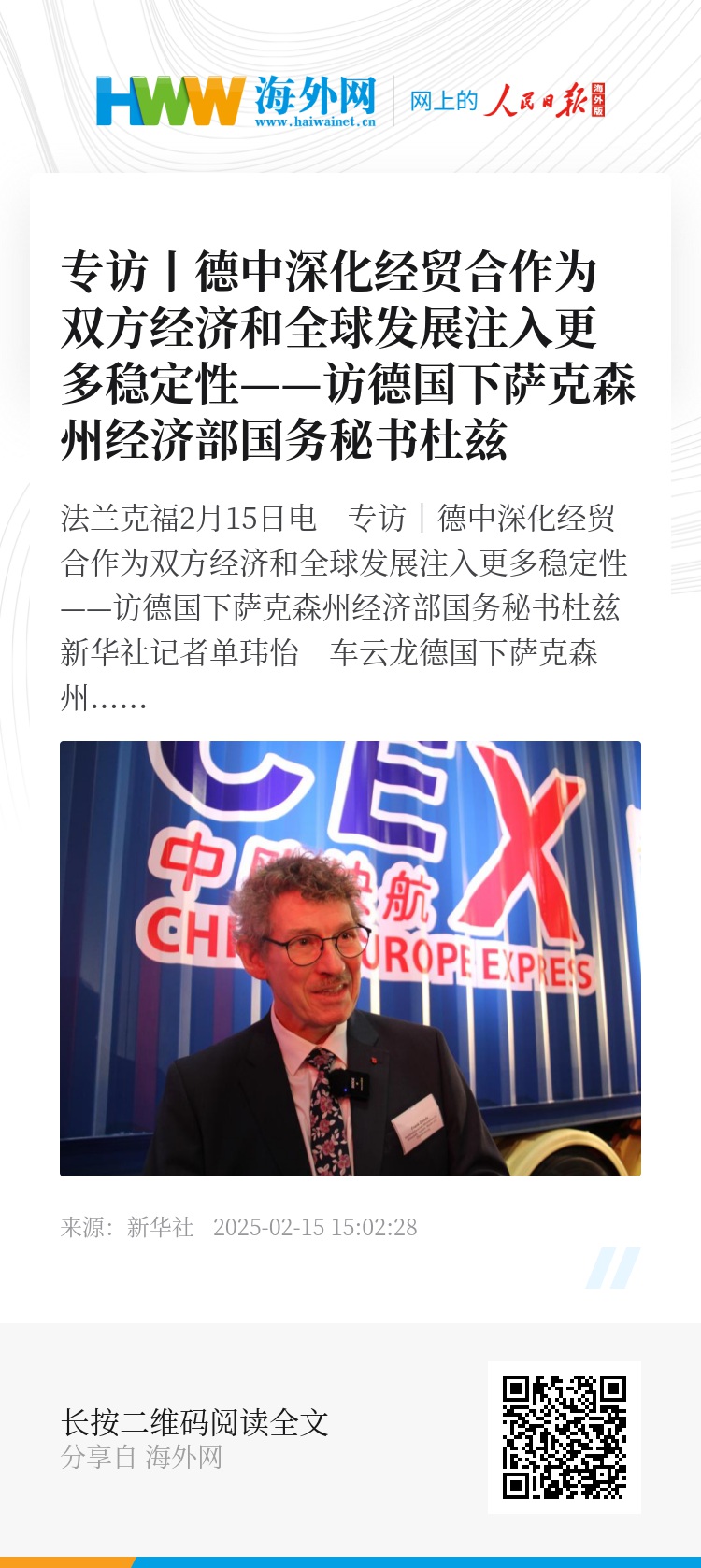 新华社法兰克福2月15日电 专访|德中深化经贸合作为双方经济和全球发展注入更多稳定性——访德国下萨克森州经济部国务秘书杜兹