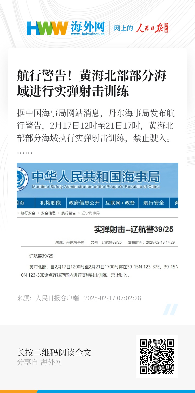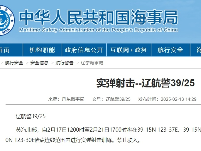 据中国海事局网站消息,丹东海事局发布航行警告,2月17日12时至21日17时,黄海北部部分海域执行实弹射击训练,禁止驶入。