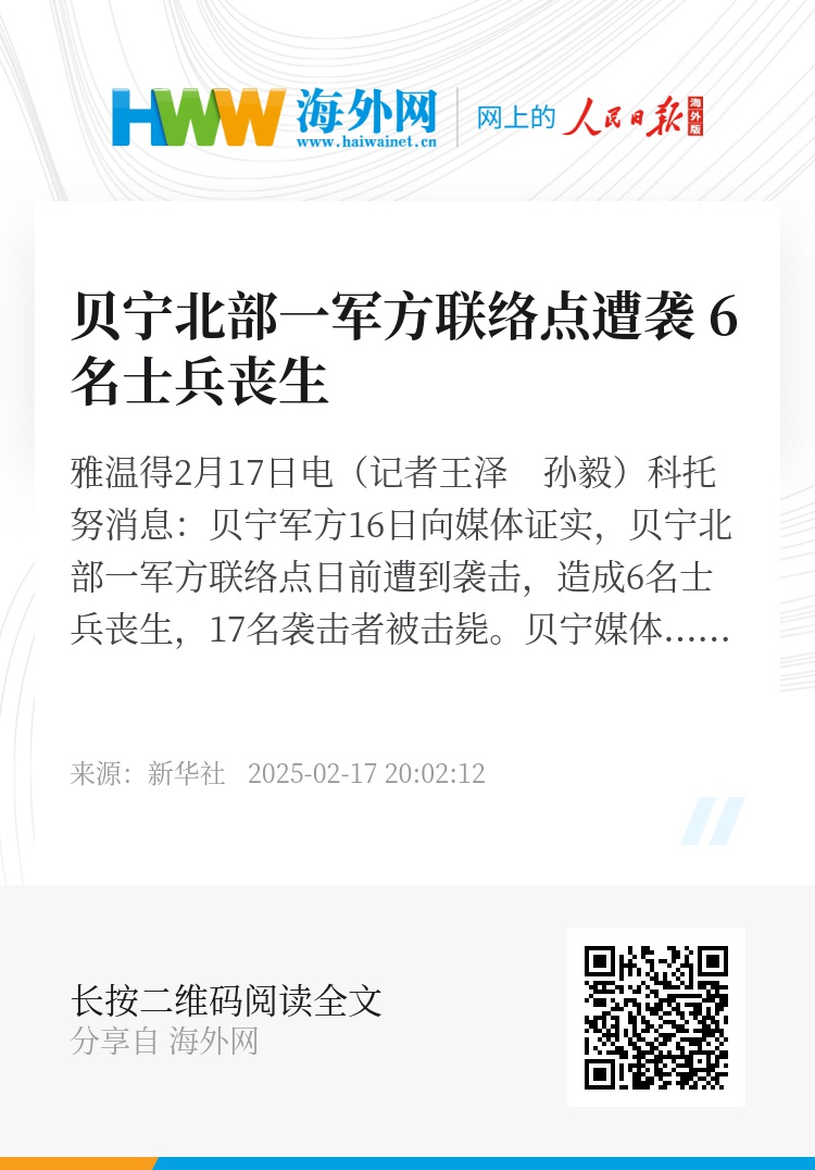 新华社雅温得2月17日电(记者王泽 孙毅)科托努消息:贝宁军方16日向媒体证实,贝宁北部一军方联络点日前遭到袭击,造成6名士兵丧生,17名袭击者被击毙。