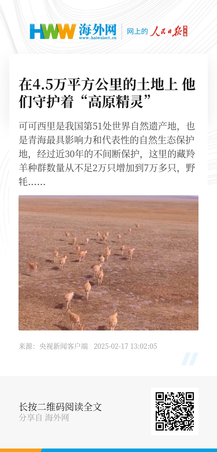 可可西里是我国第51处世界自然遗产地,也是青海最具影响力和代表性的自然生态保护地,经过近30年的不间断保护,这里的藏羚羊种群数量从不足2万只增加到7万多只,野牦牛、藏野驴等珍稀野生动物也频频出现。而这些变化的背后有这样一群巡护民警,他们巡护在可可西里4.5万平方公里的土地上。