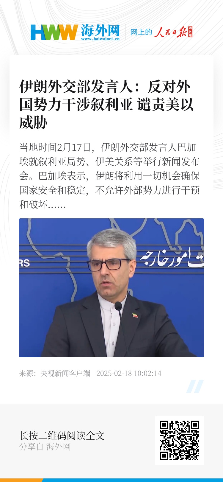 当地时间2月17日,伊朗外交部发言人巴加埃就叙利亚局势、伊美关系等举行新闻发布会。巴加埃表示,伊朗将利用一切机会确保国家安全和稳定,不允许外部势力进行干预和破坏。