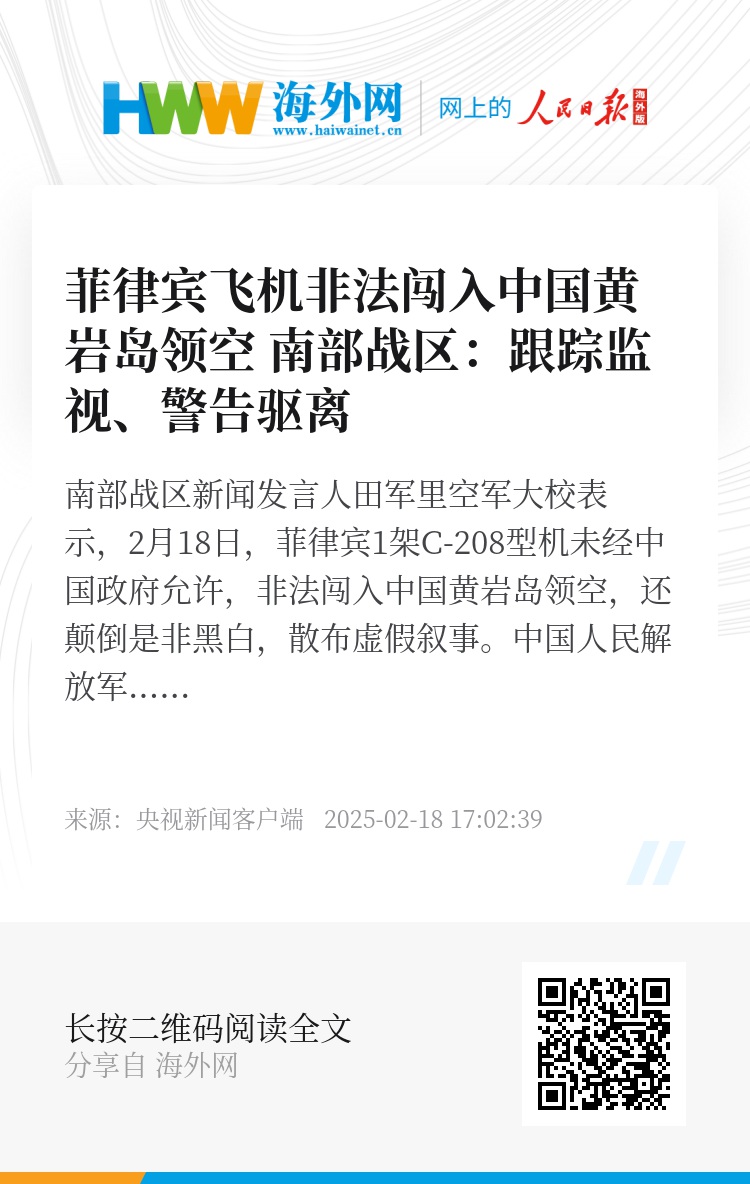 南部战区新闻发言人田军里空军大校表示,2月18日,菲律宾1架C-208型机未经中国政府允许,非法闯入中国黄岩岛领空,还颠倒是非黑白,散布虚假叙事。中国人民解放军南部战区组织海空兵力,依法依规跟踪监视、警告驱离。菲方行为严重侵犯中国主权,严重违反国际法和中国法律相关规定。