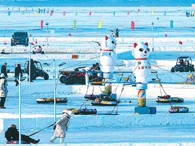 来自全国各地的游客在松花江冰雪嘉年华游玩,冰天雪地在黑龙江哈尔滨变成“金山银山”。耿洪杰摄(人民图片)