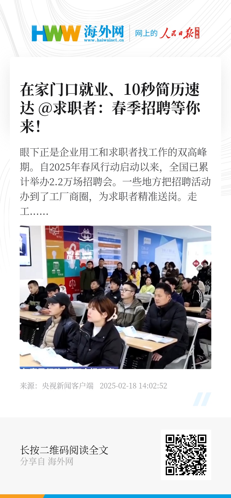 眼下正是企业用工和求职者找工作的双高峰期。自2025年春风行动启动以来,全国已累计举办2.2万场招聘会。一些地方把招聘活动办到了工厂商圈,为求职者精准送岗。